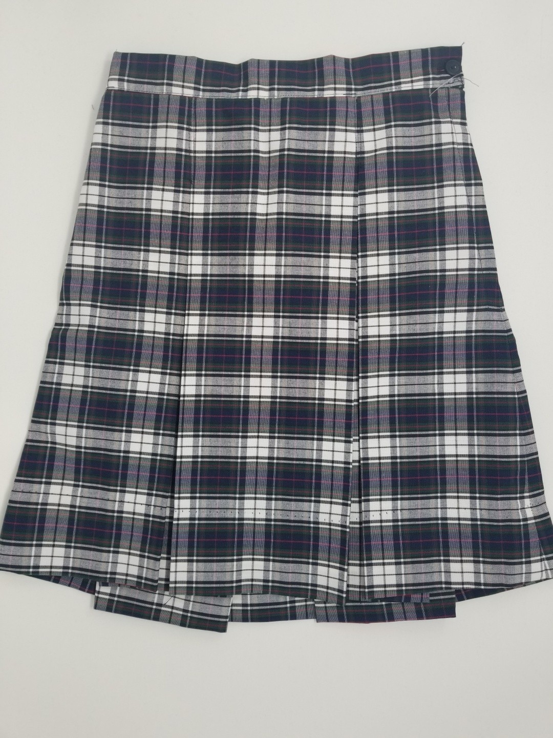 Box Pleat Skirt- Style 48. Two inverted box pleats, sewn down 2-4" depending on size. Side zipper and button. 3” to let out at hem as student grows.