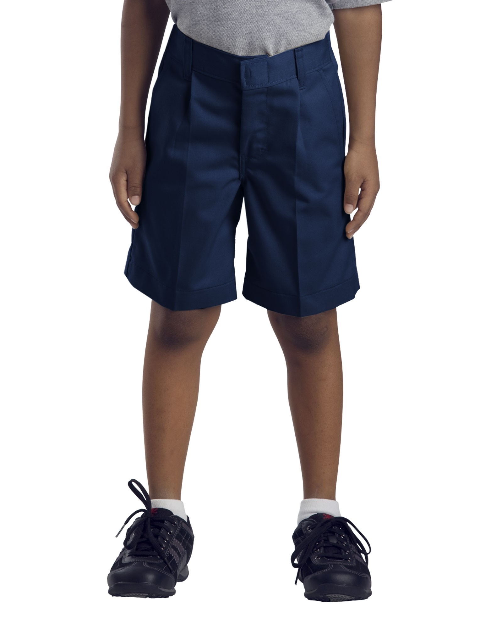 Boys Pleated Short. 8 3/4 oz. post cured twill. 65/35 poly-cotton blend. Permanent press and stain release. Fold over cloth waistband. Belt loops. 2 pleats on each side of fly. 2 front pockets and 1 back pocket. Blind stitch hem. Serged seams.