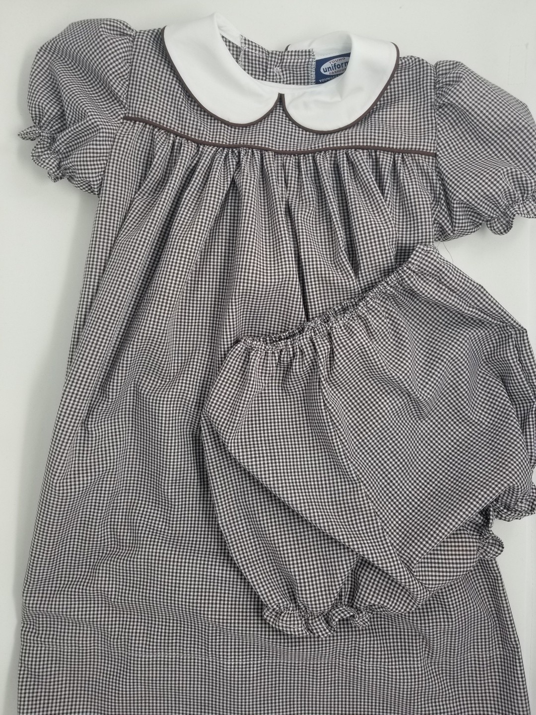 Gingham Smock Dress- Style 04. Micro gingham check material. Matching piping on collar and across the front. Gathered sleeves. White collar. 3" hem, and comes with one pair of matching bloomers.