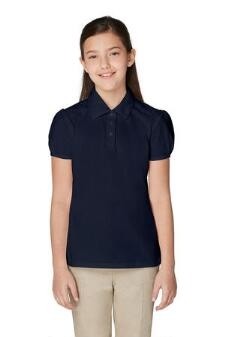 Girl Fancy Collar Knit Shirt- Short Sleeve. 60/40 poly-cotton knit shirt. 3 button opening. Picot trim on collar and sleeves. Brand may vary.