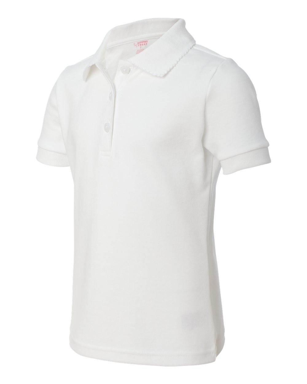 Girl Fancy Collar Knit Shirt- Short Sleeve. 60/40 poly-cotton knit shirt. 3 button opening. Picot trim on collar and sleeves. Brand may vary.
