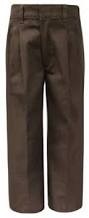 Girls Pants- Solid Color- Pleated Front. Twill material. 65/35 poly-cotton blend. Permanent press and stain release. Fold over cloth waistband. Belt loops. 2 front pockets, 1 back pocket. Pleats at waist. Blind stitch hem. Slight taper on legs.
