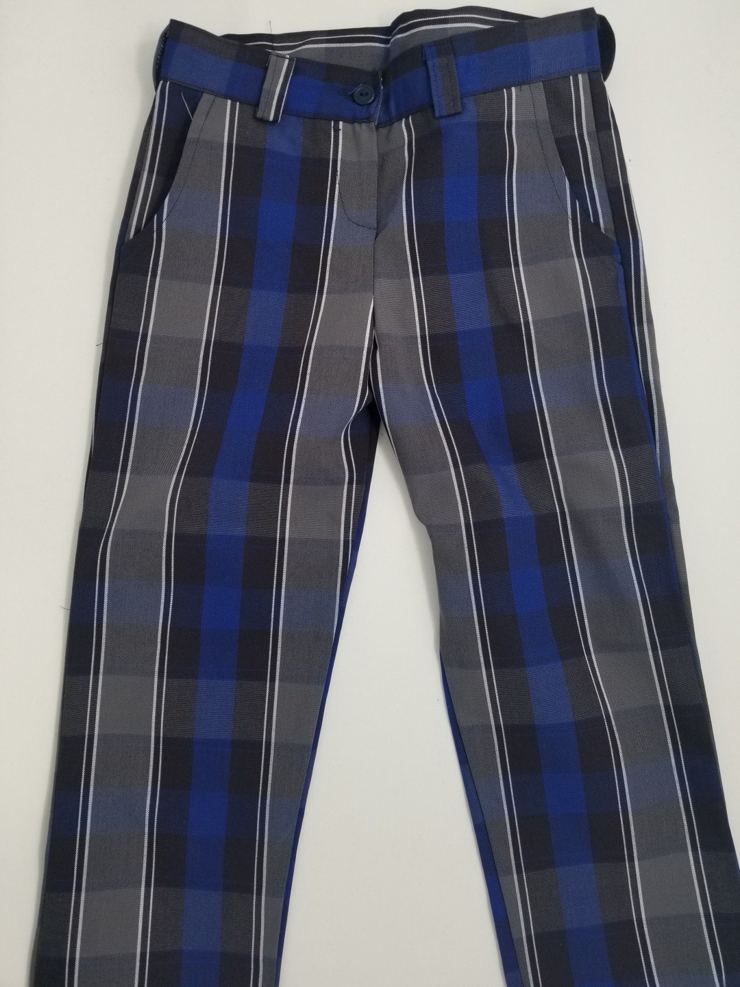 Girls Plaid Pants- Flat Front. Permanent press. Stain release. Belt loops. Flat front styling with no pleats. 2 front pockets. Blind stitch hem. Straight leg.