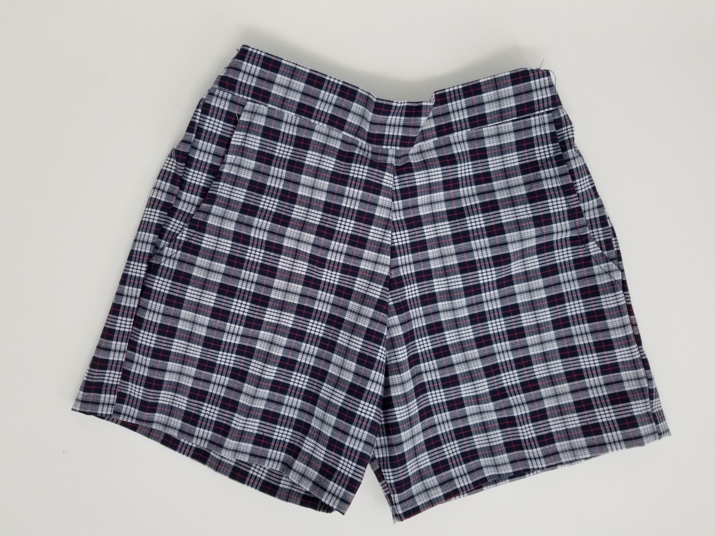 Girls Plaid Shorts. Uncuffed twill walking shorts. Uniform length. Straight leg.
