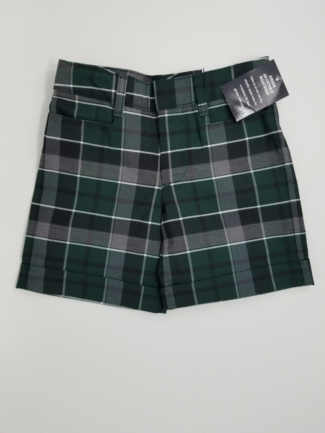 Girls Plaid Shorts. 1" cuffed hem twill walking shorts. Uniform length. Straight leg.