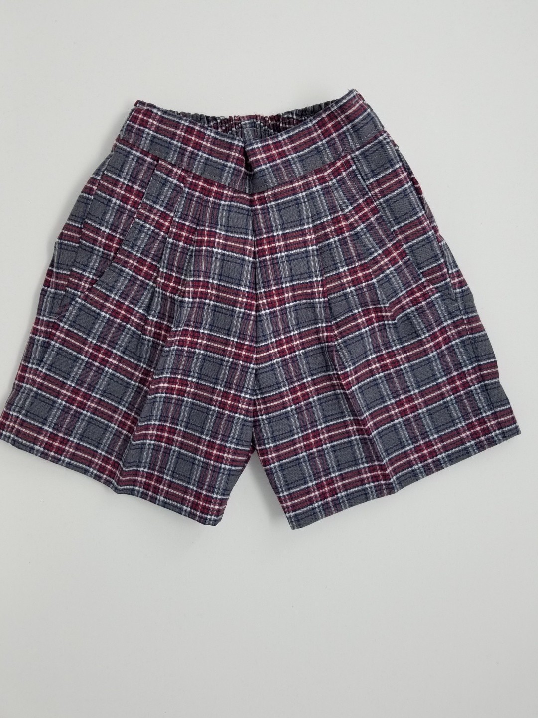 Girls Plaid Shorts. Uncuffed twill walking shorts. Uniform length. Straight leg.
