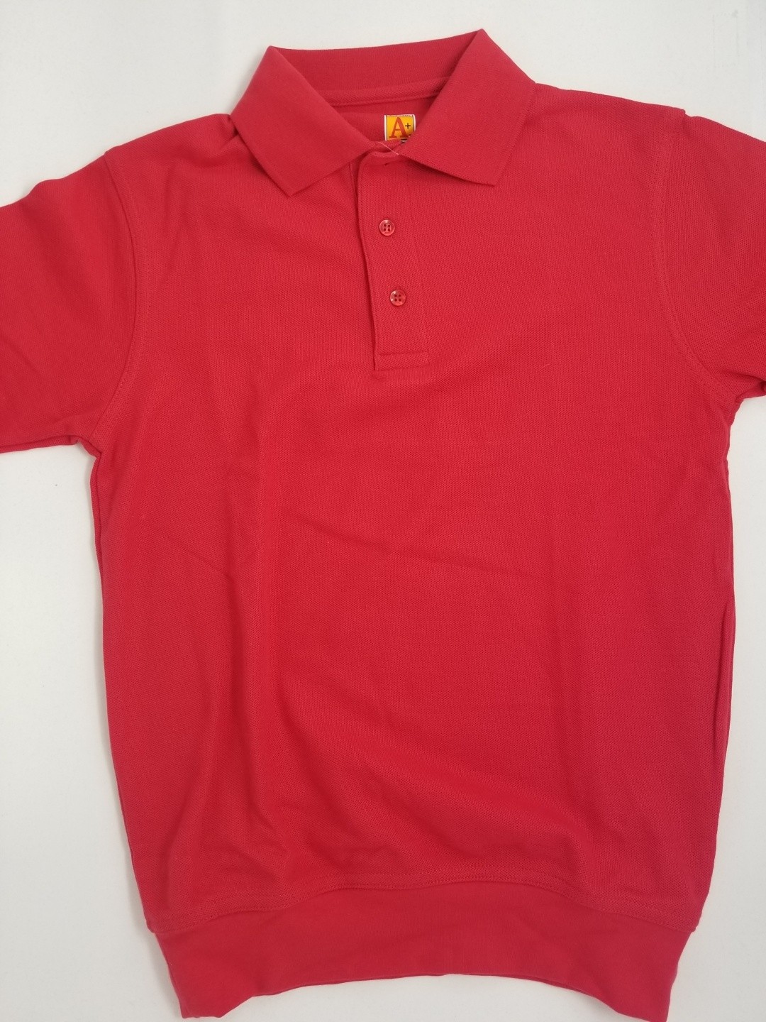 Girls Banded Bottom Knit Shirt - Pique - Short Sleeve, 50/50 poly-cotton pique knit material. Polo style. 3 button placket. Ribbed collar. Ribbed elastic cuffed sleeves. Stain repellent. Ribbed elastic at bottom so student does not need to tuck in shirt. Note: Pique knit shirts have a texture, that when looked at closely resembles a waffle. Most schools allow either smooth or pique, but make sure to check your school's requirement sheet as to which are allowed.