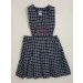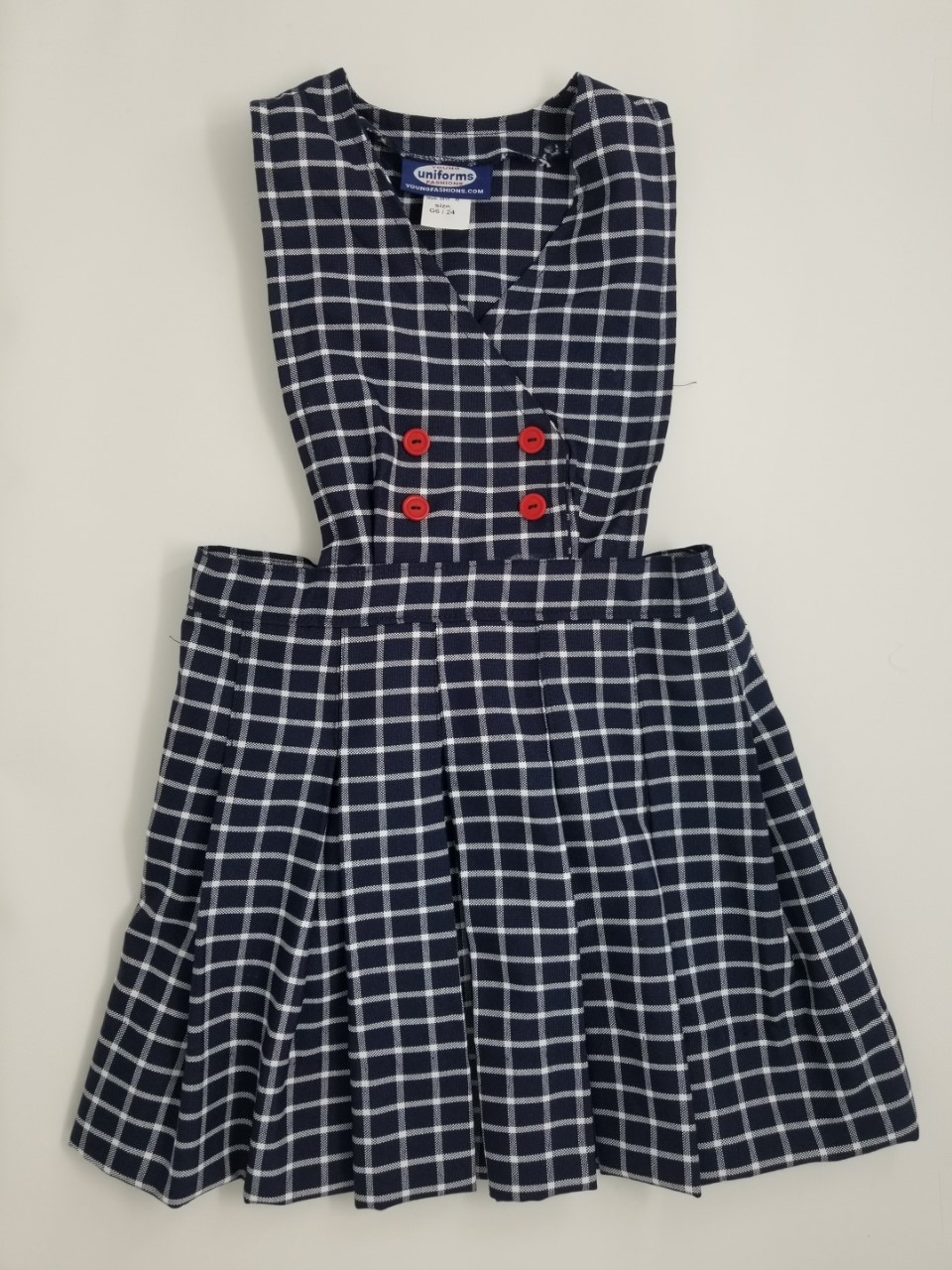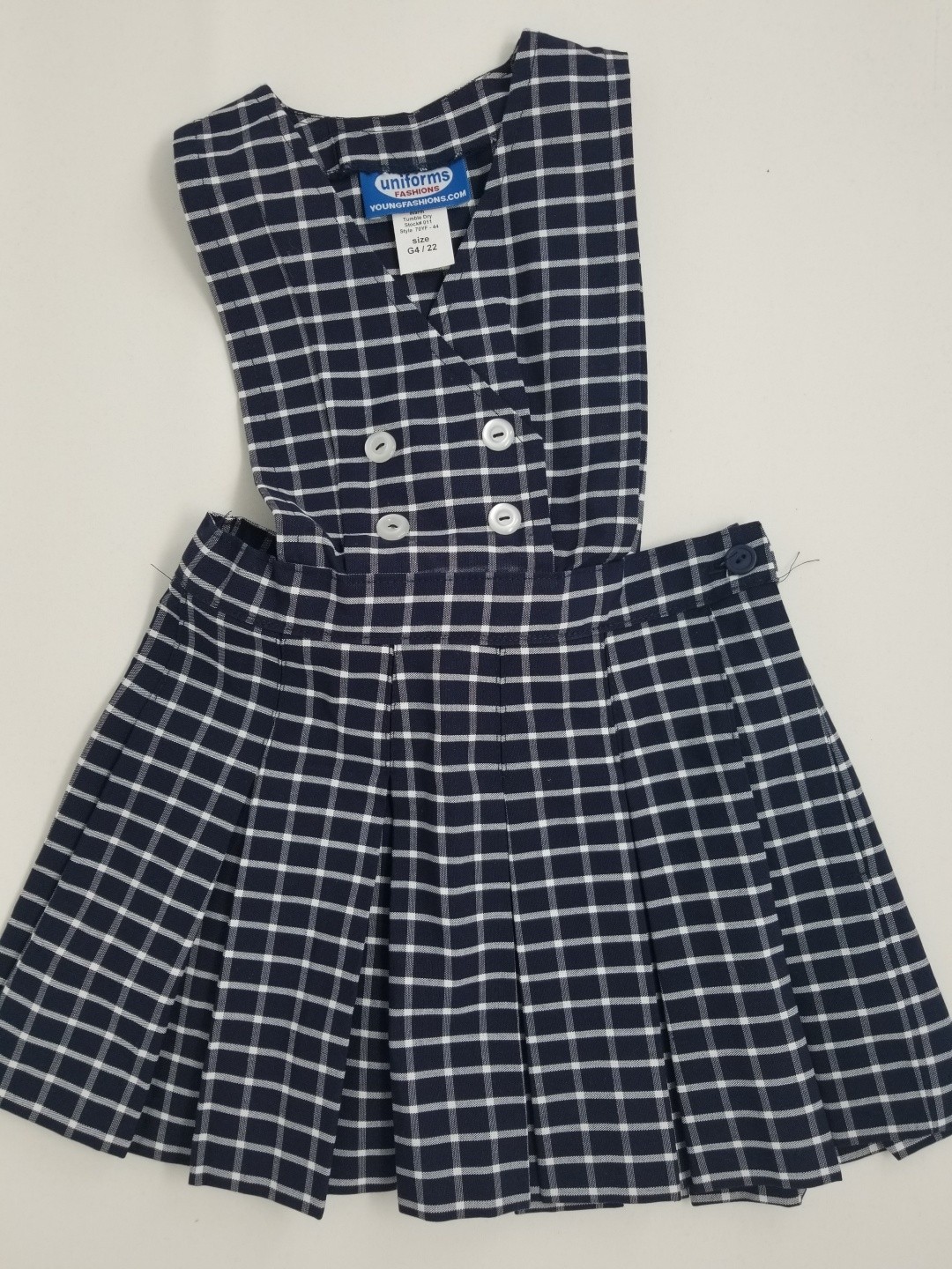 Bib Top Jumper- Style 45. Double breasted bib-top with buttons. Stitch-down pleated skirt. 3" to let out at hem. 1.5" to let down at waist. Plaid 08 has red buttons.