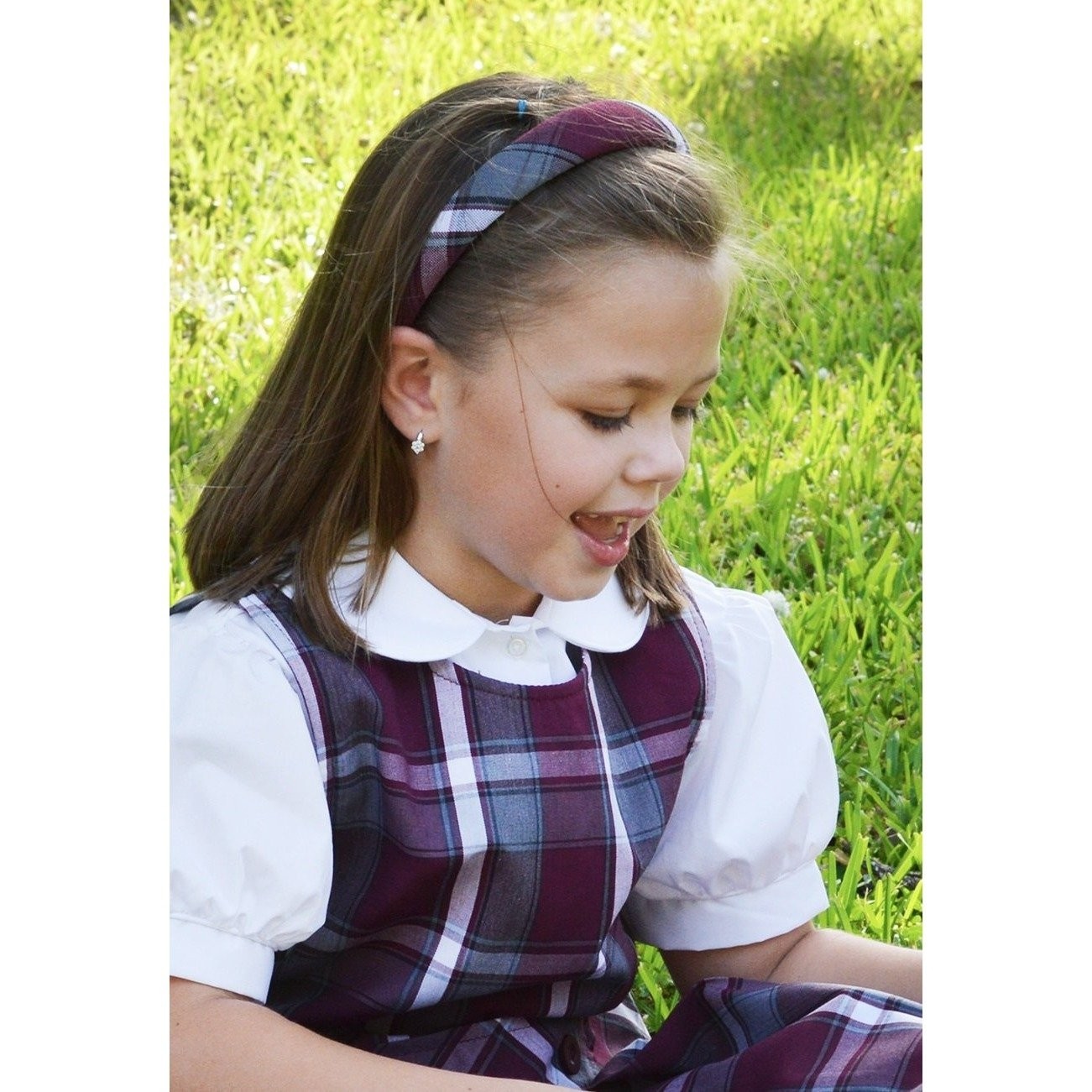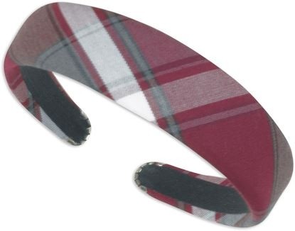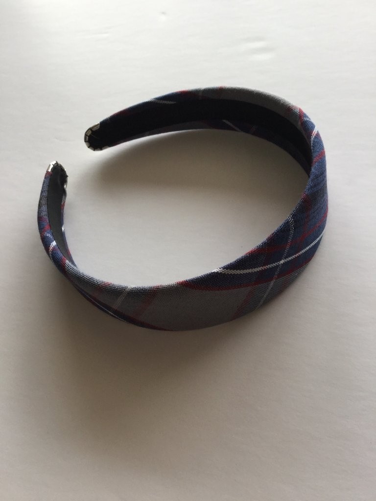 Plaid headband with felt lining inside. Brass end clips. One size fits most.