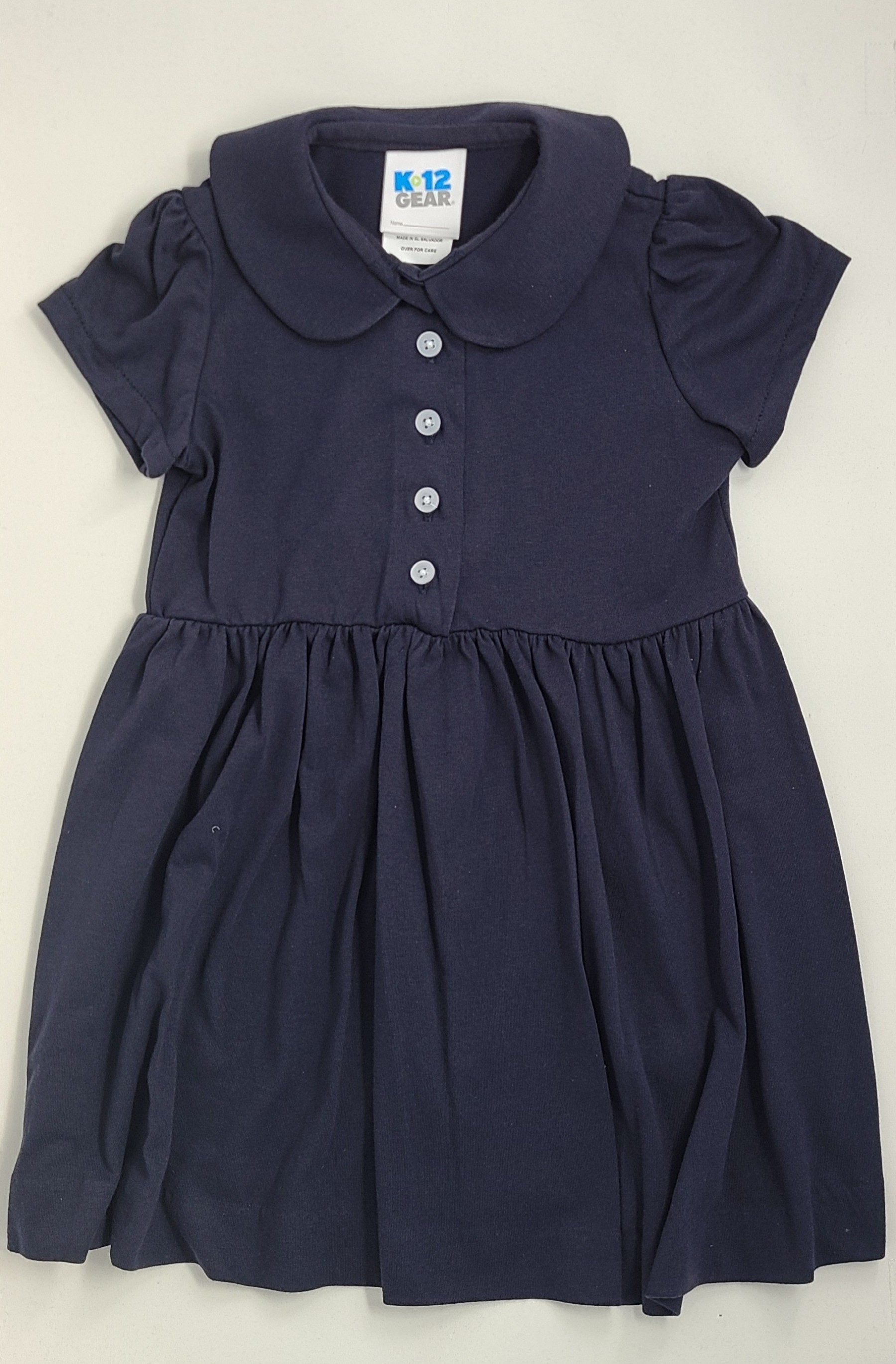 Jersey Knit Dress with Peter Pan Collar- 60/40 Jersey Knit Blend. Bodice Seam sits slightly above waist. Gathered Skirt. Five Button Front Bodice with White Buttons. Gathered Cap Sleeve. Sizes YXXS- YXL.