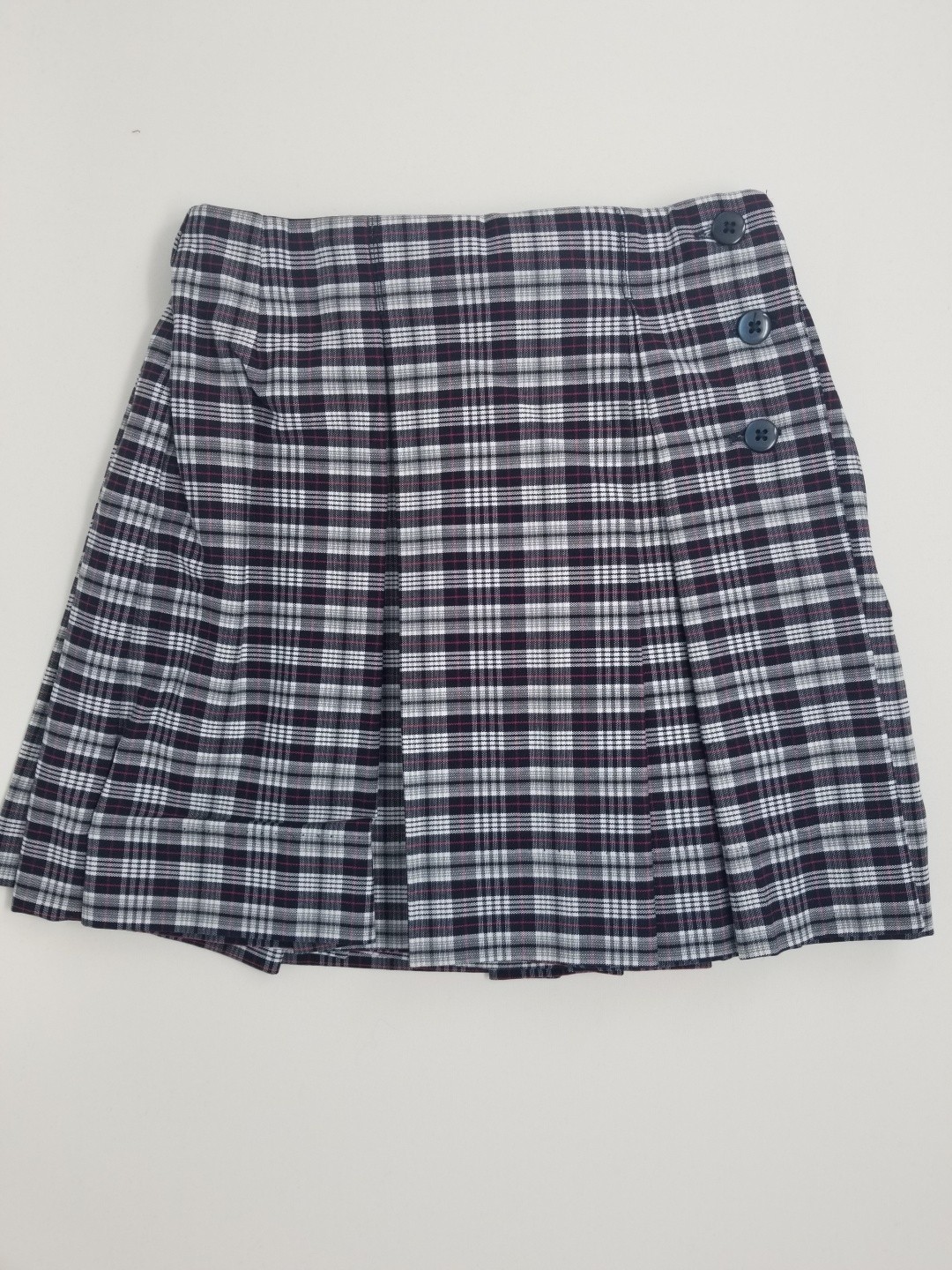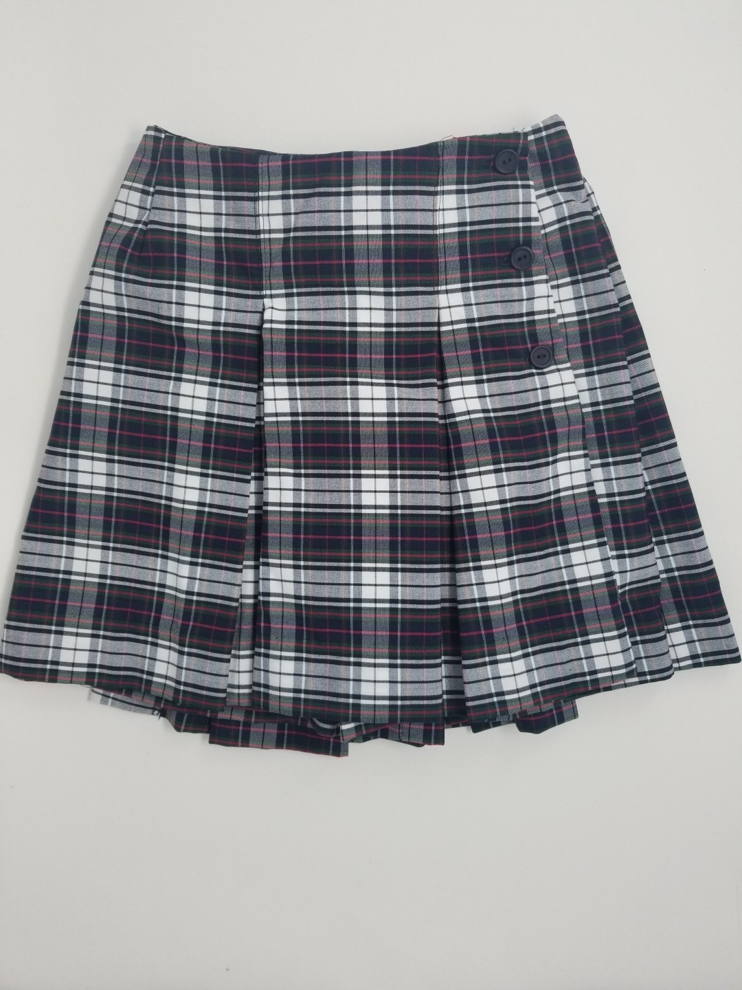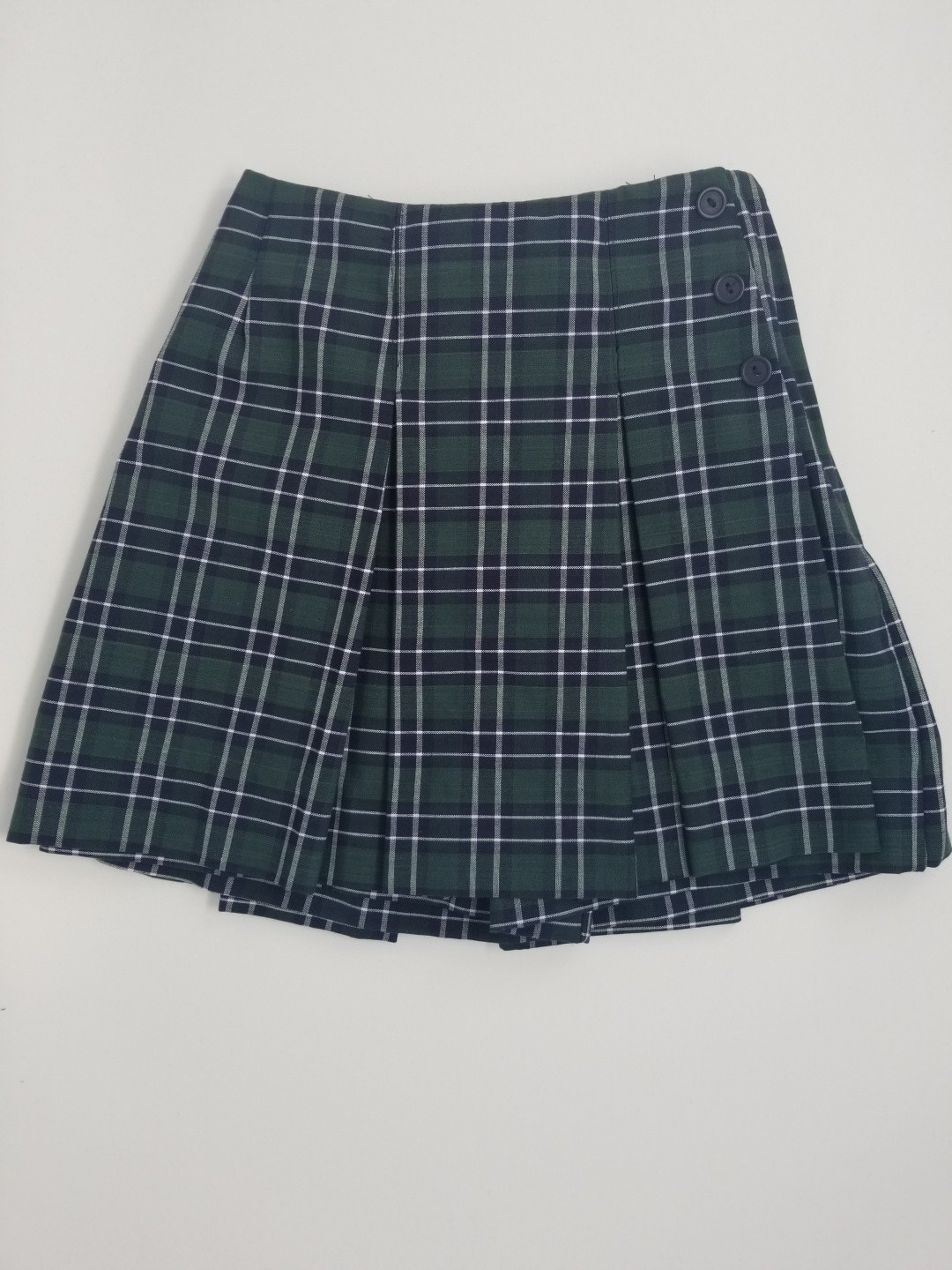 Pleated Skort- 2 inverted box pleats. 3 buttons on left side. Flap in front and back to completely hide shorts underneath. Shorts DO NOT SHOW when worn. Side zipper and button. 3” to let out at hem as student grows. - Reviews