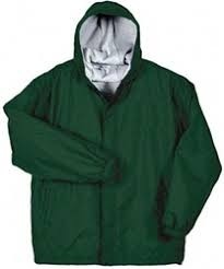 Lined, hooded jacket. Nylon outer. Heavyweight ash gray fleece lining. Elastic hem and cuffs. Two zippered side pockets. Full-length front zipper. Elastic hood in youth sizes. Drawstring hood in adult sizes.