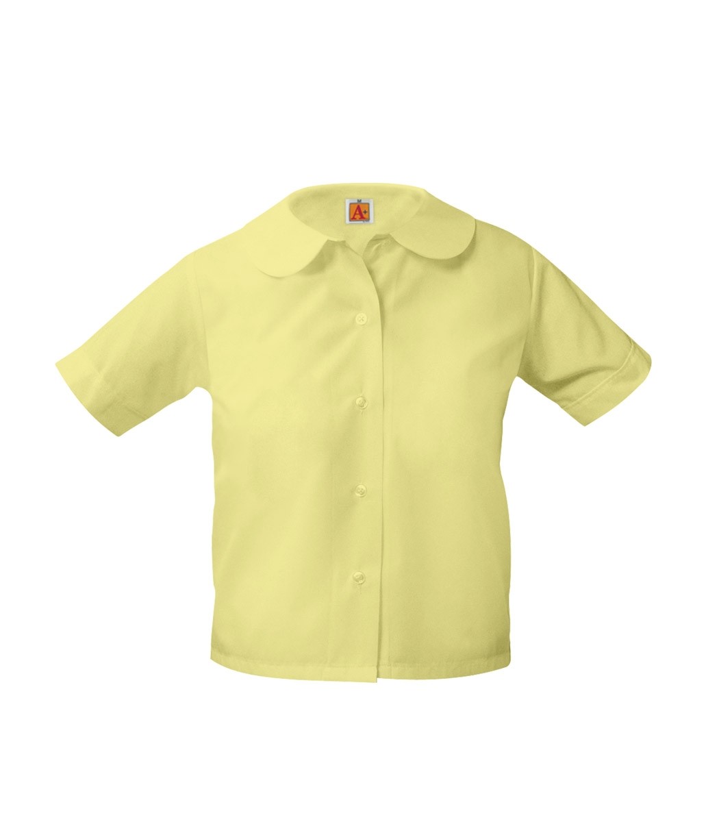 Girls Broadcloth Peter Pan Blouse - Short Sleeve, 65/35 poly-cotton broadcloth fabric. Button front. Wrinkle resistant material. Back darts. Pocket on left chest. Rounded collar. Brand may vary.