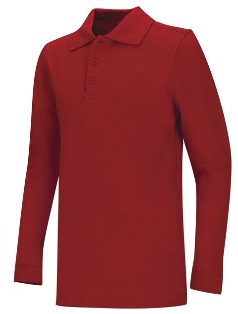 Pique Polo- Long Sleeve. 50/50 poly-cotton pique knit material. Unisex polo style. 3 button placket. Ribbed collar and ribbed knit cuffs. Stain repellent. Note: Not all schools allow the pique material. Please make sure that you follow the guidelines for your school.
