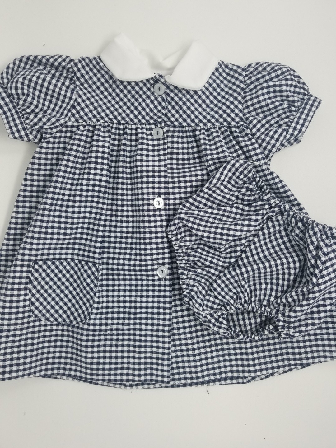 Plaid Smock Dress Button-front dress. Peter pan collar (white or plaid, depends on plaid, also may have piping). Optional pockets. Comes with one pair of matching bloomers.