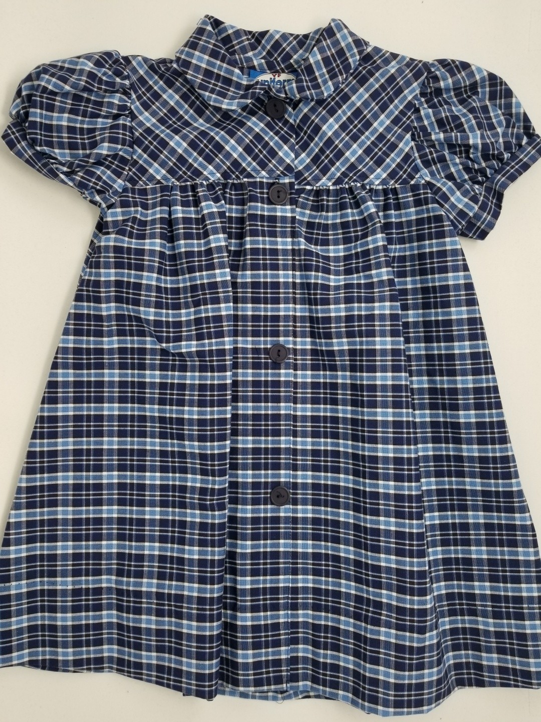 Plaid Smock Dress Button-front dress. Peter pan collar (white or plaid, depends on plaid, also may have piping). Optional pockets. Comes with one pair of matching bloomers.