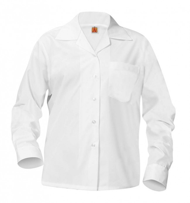 Sports Collar Blouse - Long Sleeve. 65/35 poly-cotton broadcloth material. Button front. Wrinkle resistant. Back darts. Pocket on left chest. Pointed collar. Brand may vary.