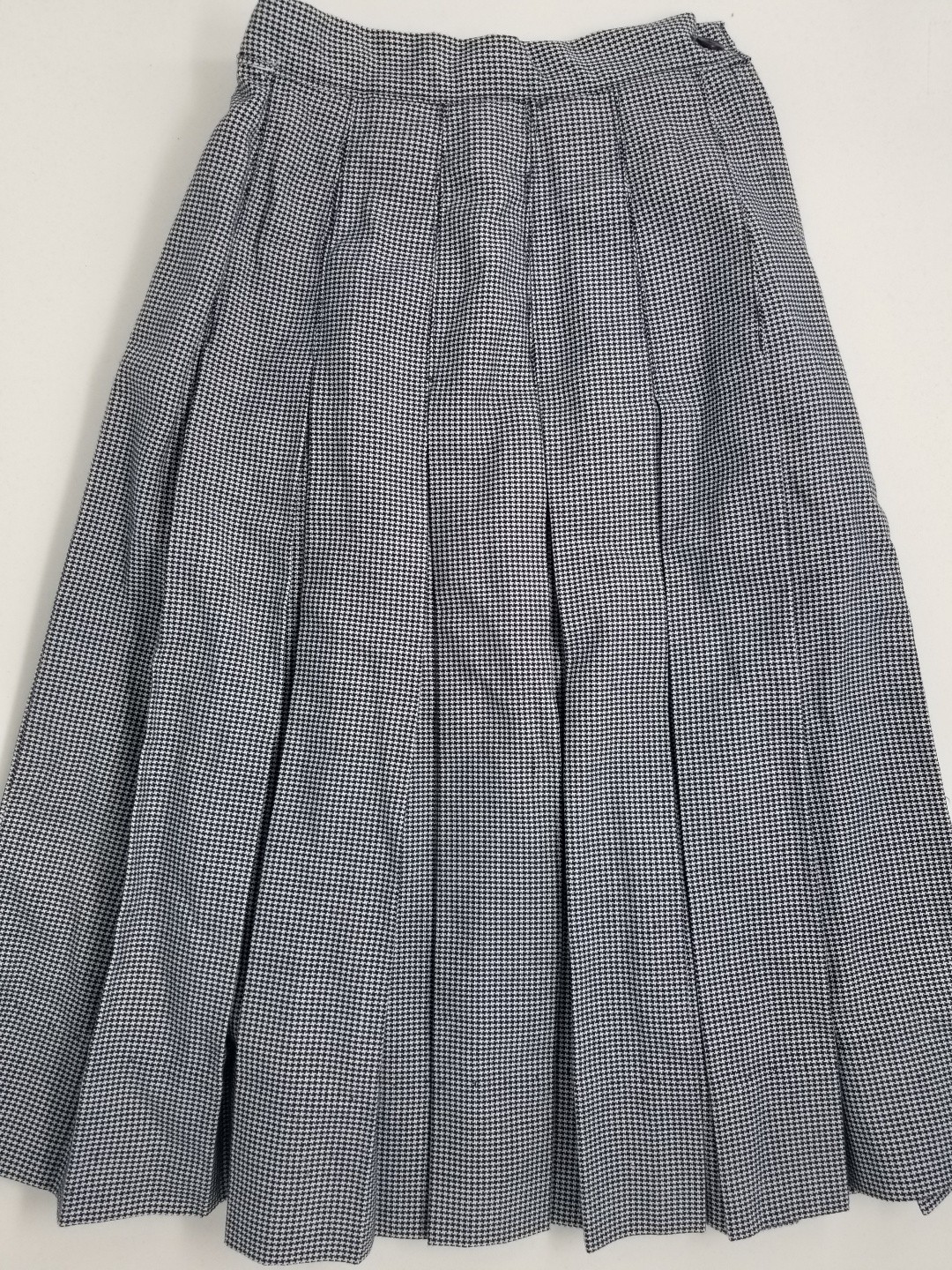 Stitch Down Pleat Skirt- Style 11. Pleated skirt with pleats stitched down 2-4" based on size for a flattering look across hips. Side zipper and side button. 3” to let out at hem as student grows.