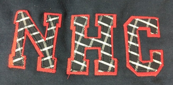 Crew neck sweatshirt with applique letters on front. Each letter is hand cut and hand-sewn to shirt. Each letter has a solid color or plaid "top" layer and a washable solid color felt "bottom" layer School administrators choose each design. If you want to "create" one that is not listed, please call 800-824-4154. Please allow extra time for these items to ship.