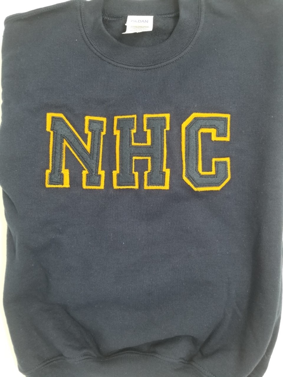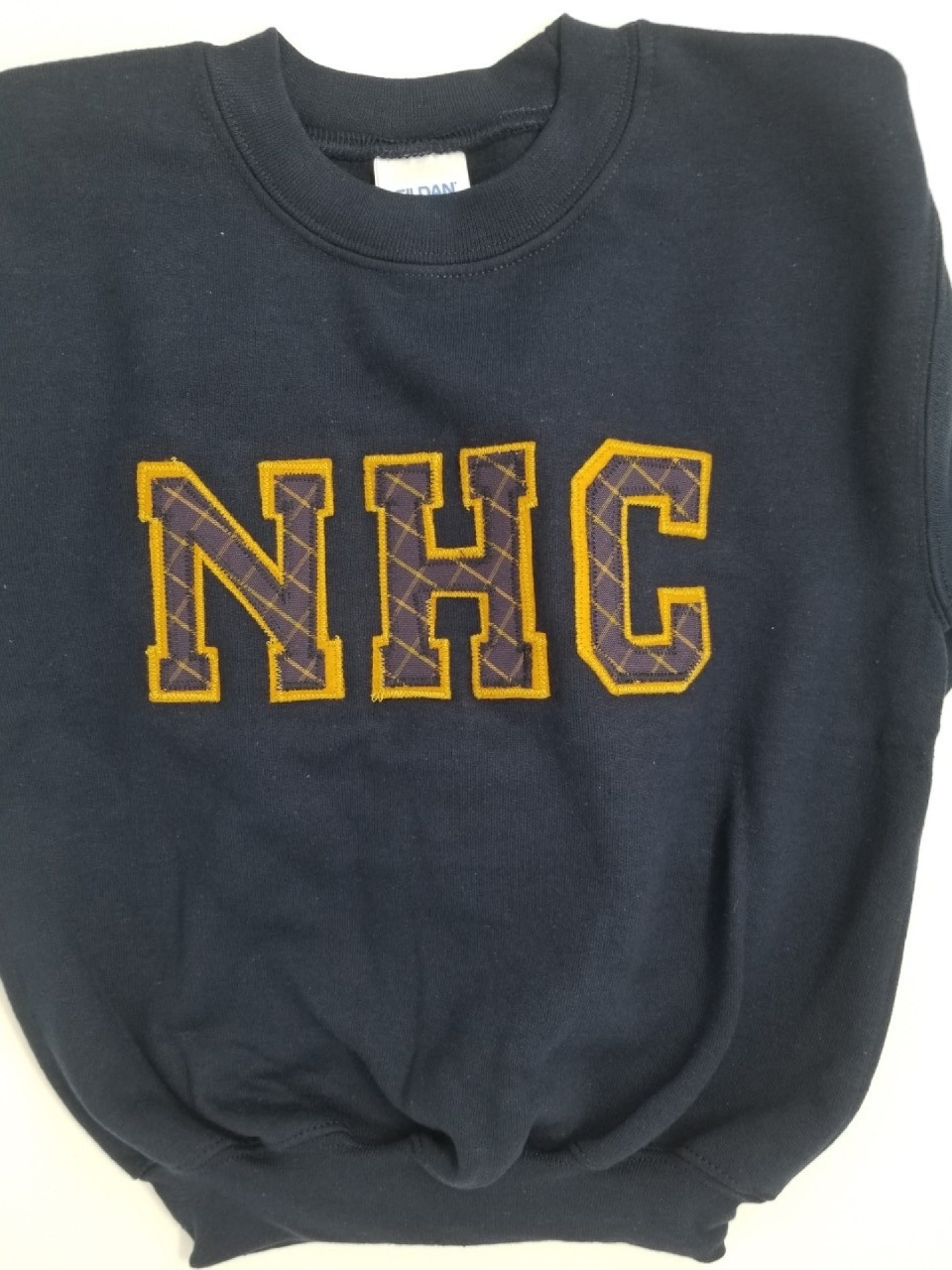 Crew neck sweatshirt with applique letters on front. Each letter is hand cut and hand-sewn to shirt. Each letter has a solid color or plaid "top" layer and a washable solid color felt "bottom" layer School administrators choose each design. If you want to "create" one that is not listed, please call 800-824-4154. Please allow extra time for these items to ship.