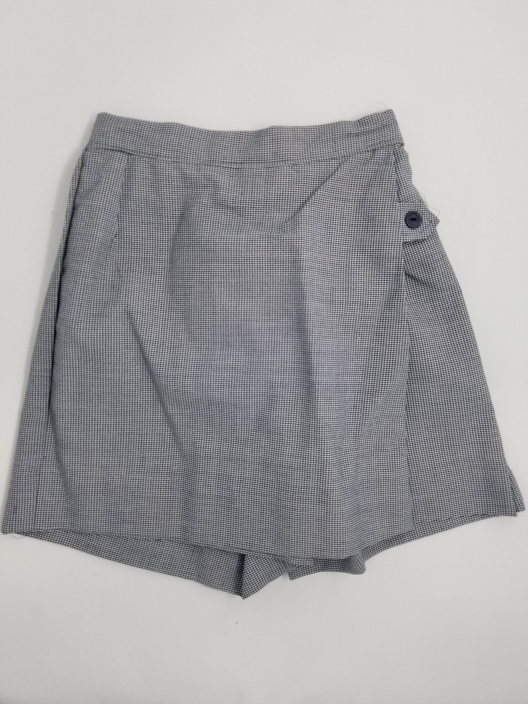 Straight A-Line style skort. One tab with button on left side. Flap in front and back to completely hide shorts underneath. Side zipper and button. 3” to let out at hem as student grows.