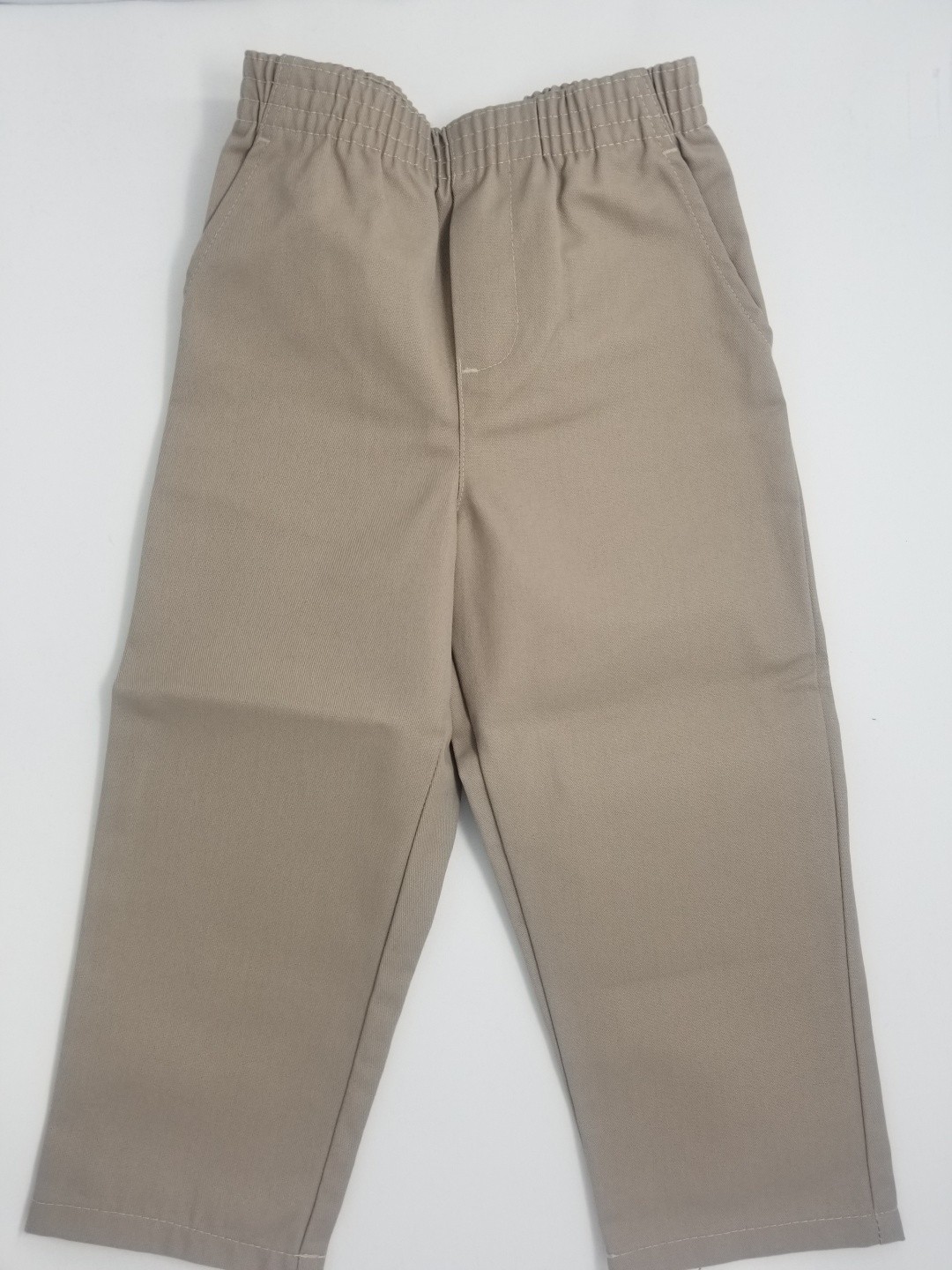Toddler Pull-On Pant- Solid Colors. 65/35 poly-cotton twill pant with all-around elastic waist. Blind stitch hem. No pleats. 2 front pockets. Designed for toddler age children but sizes go up to youth 14. Unisex styling for both boys and girls. - Reviews
